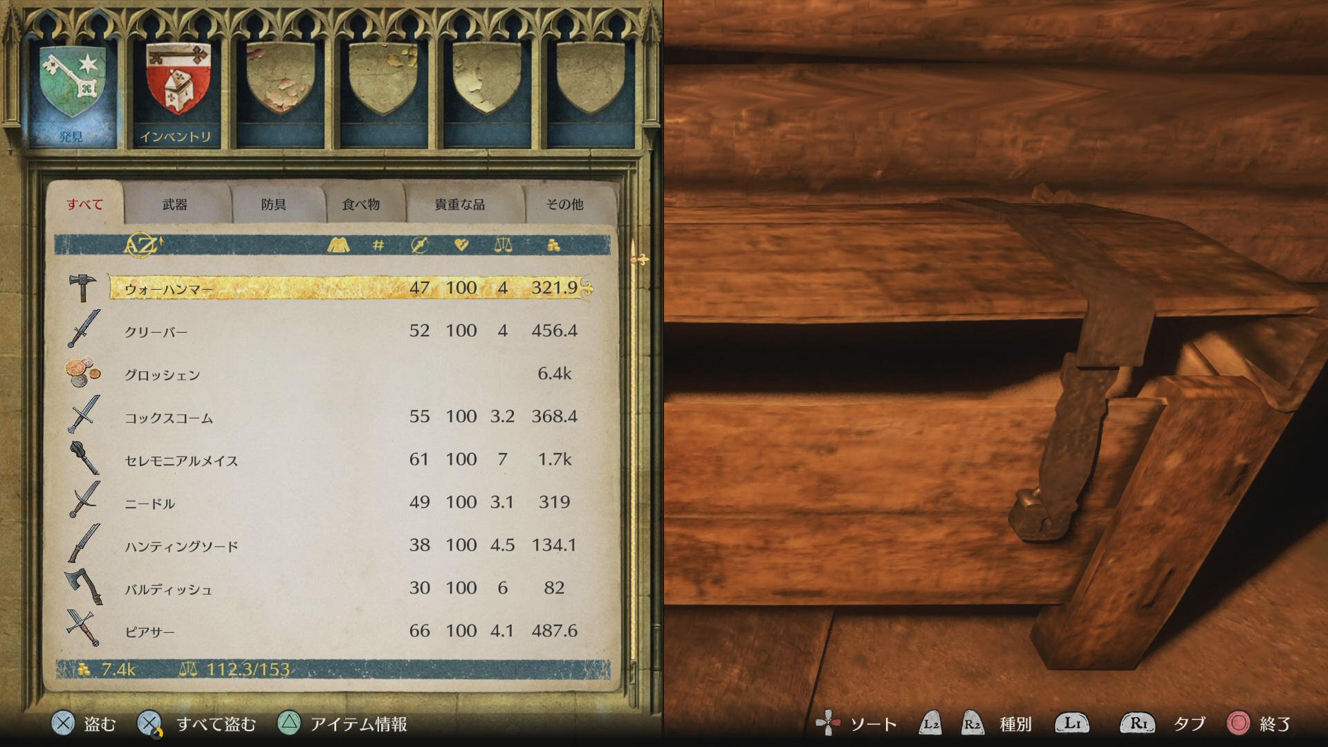 ラッタイの武器屋の正面のドアを開けっ放しにしておいて、店主は20時、見張りは21時すぎに帰るので、その隙に忍び込んでドアを閉めて陳列されてある物を盗んでペシェクに持っていけばそこそこ金が稼げます。